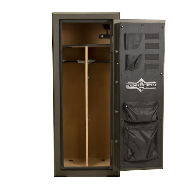 The SureLock Security Gen II Cadet Series Gun and Home Safe holds up to 18 guns with a total of 8, 1.25" thick locking bolts (4 active). It has two gun racks, three adjustable shelves and an interior organizational door panel to provide additional space and storage for smaller items. With a powder coated, textured dark mocha finish and desert sand accents, the Cadet Series is as easy on the eyes as it is on the wallet. The matching light tan interior felt completes the Cadet 18 look, while the 3-spoke handle and SecuRam digital lock make sure that safety is always the first priority.